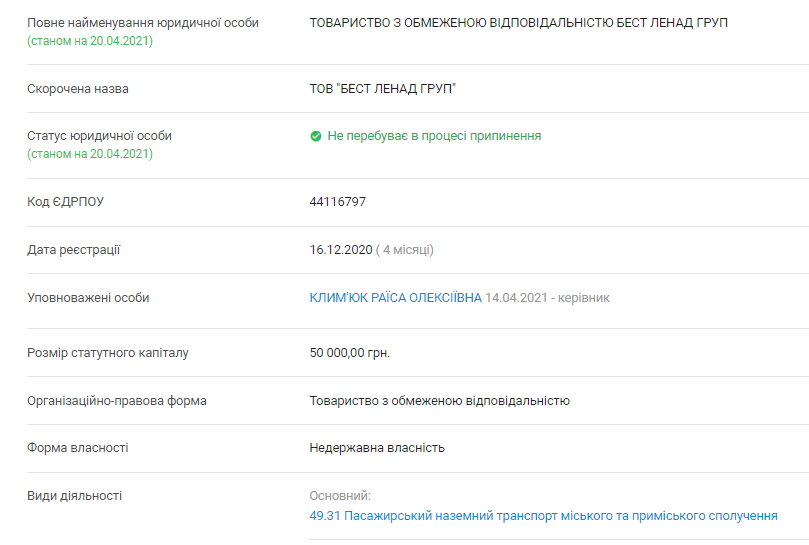 Згідно з даними пошукової системи youcontrol, ТОВ ТОВ «БЕСТ ЛЕНАД ГРУП» створене чотири місяці тому – 16 грудня 2020 року. Спочатку воно було зареєстроване в місті Києві за адресою: вул. Євгена Сверстюка, будинок 2А. Основний вид діяльності – пасажирський наземний транспорт міського та приміського сполучення.