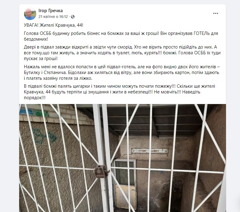 Лучанин звинувачує голову ОСББ в тому, що той нібито влаштував «готель» для безхатченків у підвалі будинку. Також він стверджує, що зайти туди можна лише, попередньо заплативши.