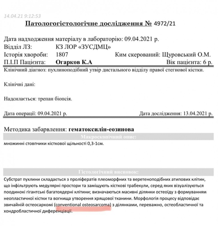 Медики виявили у хлопчика остеосаркому – злоякісну пухлину у правій стегновій кістці, пише Район.in.ua.