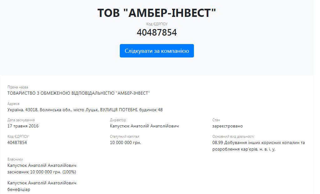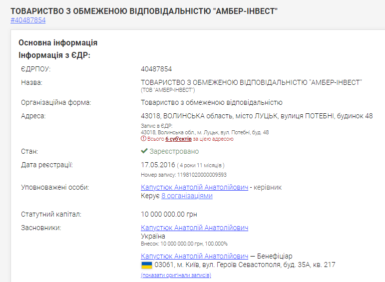 Цікаво, що до жовтня 2020 року співвласником Капустюка був Ігор Ярославович Хомин, зареєстрований у місті Коростень Житомирської області. Він мав половину акцій «Амбер-інвест». Але тепер компанія зі статутним капіталом 10 мільйонів гривень і юридичною адресою: Луцьк, вулиця ПотебнІ, 48 повністю належить Анатолію Капустюку.