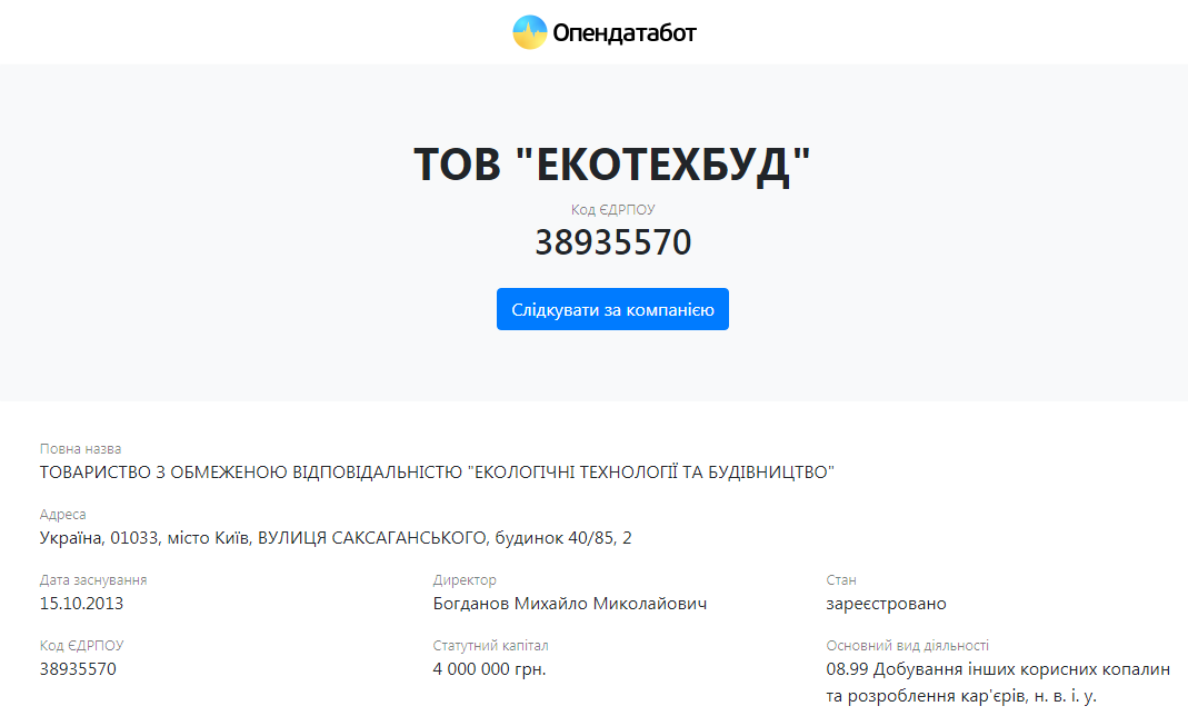 Капустюка, Хомина і Шалигіна пов’язує участь у ТОВ «ЕКОЛОГІЧНІ ТЕХНОЛОГІЇ ТА БУДІВНИЦТВО», скорочено «Екотехбуд».
