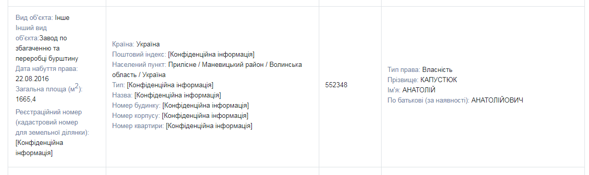 Але й це ще не все. Згідно з декларацією тепер уже повноправного директора КП «Волиньприродресурс» Анатолія Капустюка, завод із збагачення та переробки бурштину в селі Прилісне, адмінбудівля, насосна станція, як і земля під ними, сьогодні належать саме йому. А раніше він ділив ці об’єкти з Ігорем Хоминим. 50 на 50.