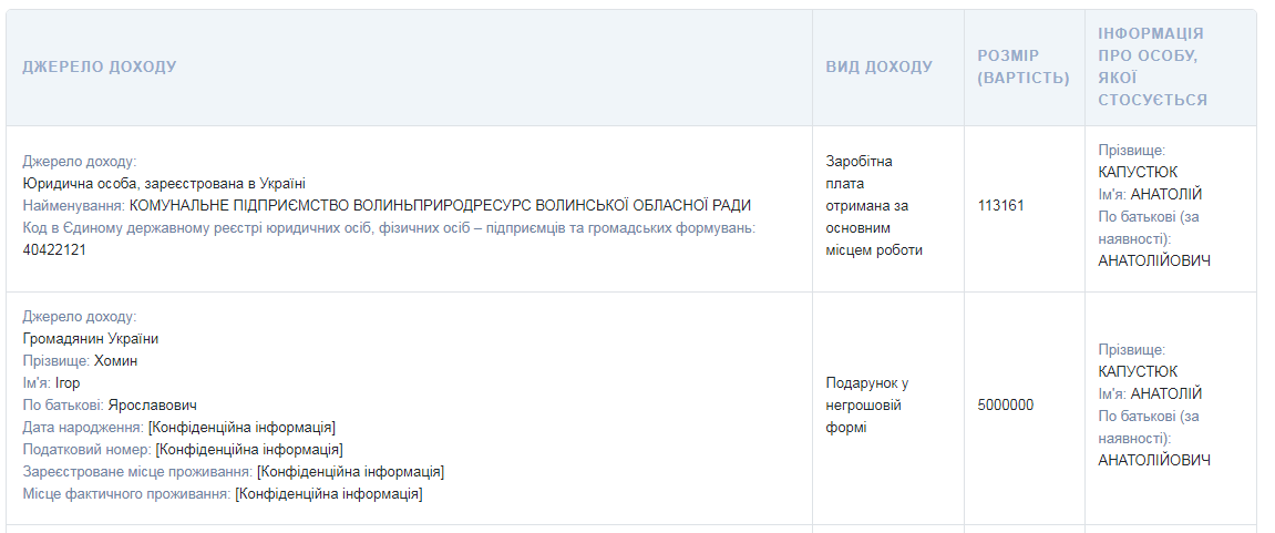 У 2020 році, судячи з декларації Капустюка, Хомин зробив йому подарунок у негрошовій формі вартістю 5 мільйонів гривень.