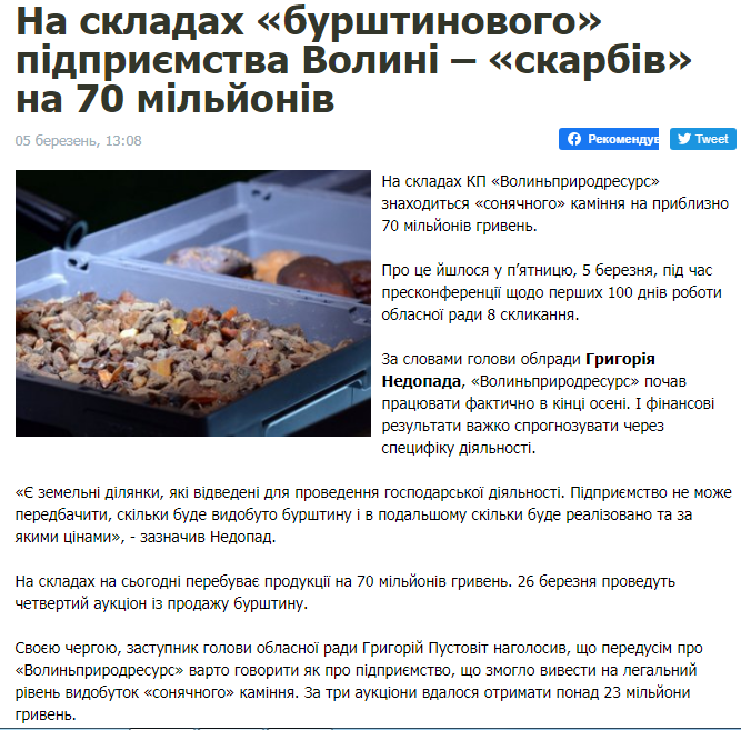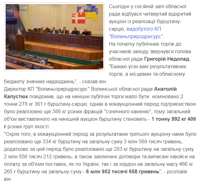 «На цю пору підприємство «Волиньприродресурс» в загальному від продажу бурштину вже залучило 23 з половиною мільйона гривень».