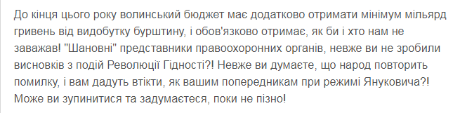 «Тоді всі зрозуміють, кому належать надра: не якимось фінансовим корпораціям чи компаніям зі Львова, з Києва, з Волині, а належить народу. І народ має добувати і мати прибуток від цього».