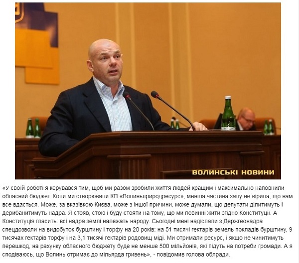 «Сьогодні мені надіслали з Держгеонадра спецдозволи на видобуток бурштину і торфу на 20 років: на 51 тисячі гектарів земель покладів бурштину, 9 тисячах гектарів торфу і на 3,1 тисячі гектарів родовищ міді. Ми отримали ресурс, і, якщо не чинитимуть перешкод, на рахунку обласного бюджету буде не менше 500 мільйонів, які підуть на потреби громади. А я сподіваюсь, що Волинь отримає до мільярда гривень».