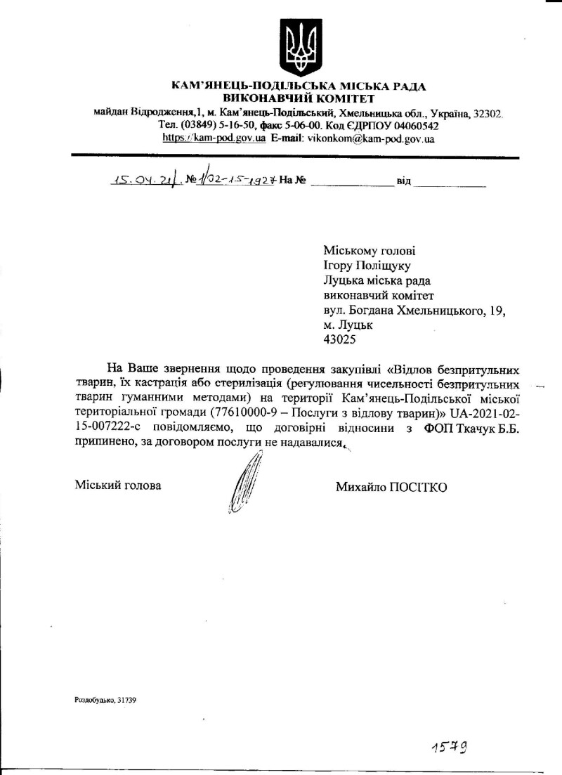 На адресу міського голови Ігоря Поліщука надійшов лист від Михайла Посітка, Кам'янець-Подільського міського голови, у якому той повідомляє про припинення договірних відносин з ФОП Ткачук Б.Б. та про те, що послуги за цим договором не надавались.