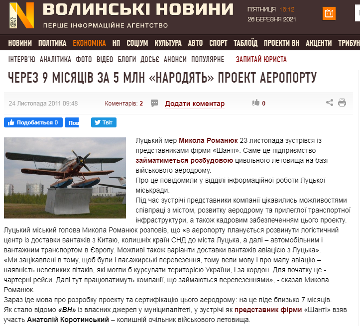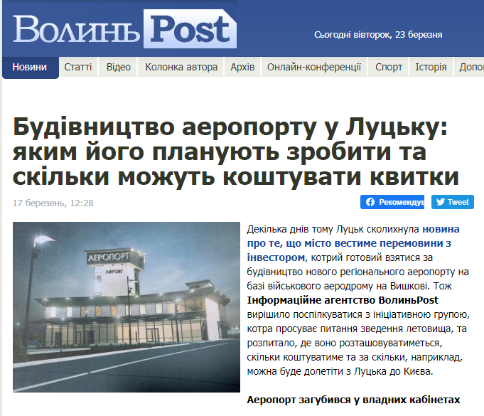Натомість на сайті інформагенції «ВолиньPost» з’явилася публікація про двох луцьких мрійників, які носяться з ідеєю збудувати у місті аеропорт ще з 2012 року.