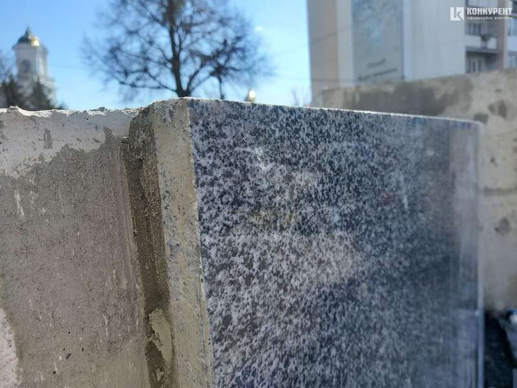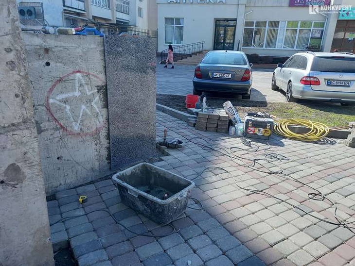 На місці працюють двоє будівельників. Вони нарізають плити на шматки та приклеюють їх до конструкції фонтану. Кажуть, навіть попри те, що фонтан овальний, робити це не особливо важко.