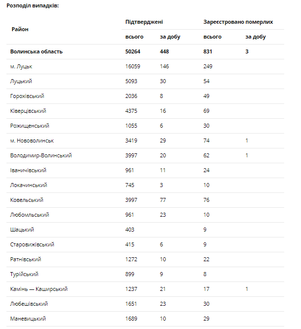 Головний державний санітарний лікар Волинської області інформує, що за останню добу на Волині зареєстровано 448 нових підтверджених випадків коронавірусної хвороби COVID-19 (з них дітей – 23, медпрацівників – 29). Одужало за добу – 340 осіб, летальних випадків – 3.