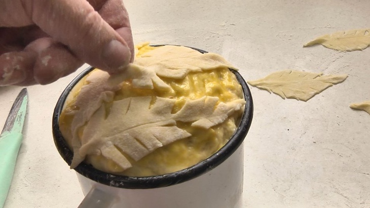 Поки тісто підіймається, жінка робить прикраси: квіти, листя, метелики і пташки. Далі тісто на великодню випічку поміщає у форми і залишає знову підростати.