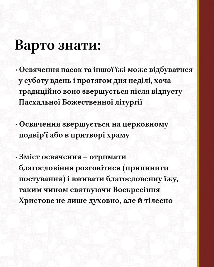 У ПЦУ наголошують, що освячення пасок, яєць та м’яса звершується задля отримання вірянами благословення розговітися, тобто завершити постування, після обмежень Великого посту.