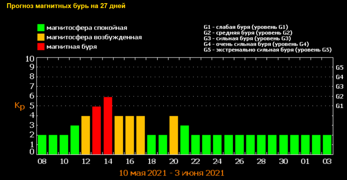Магнітна буря триватиме 6 днів – з середи 12 травня до понеділка 17 травня. Потім підвищена сонячна активність також очікується 20 травня. Сплески 12, 15-17 і 20 травня будуть несильними. А ось бурі 13 і 14 травня будуть найсильнішими за минулий період 2021 року. Метеочутливим людям слід дотримуватися обережності в ці дні.