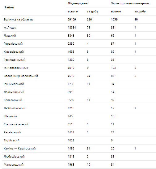 За останню добу на Волині зареєстровано 226 нових підтверджених випадків коронавірусної хвороби COVID-19 (з них дітей – 11, медпрацівників – 9). Одужало за добу – 596 осіб, летальних випадків – 10.