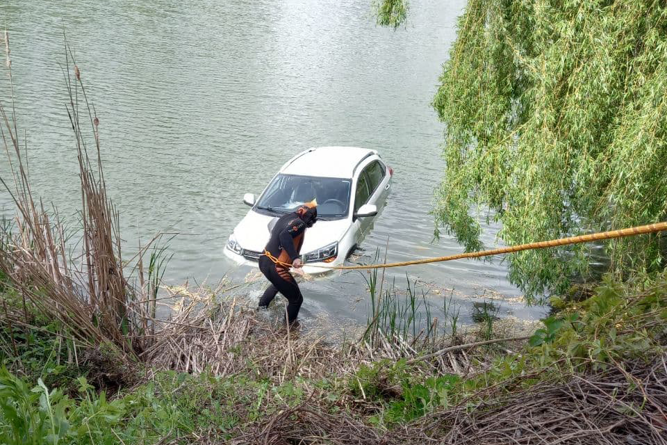 Щоб закріпити лебідку на авто, у водойму спустилися водолази. Відтак об 11:57 за допомогою спецавтомобіля САРМ працівники групи рятувальних робіт відбуксирували автівку з водойми.