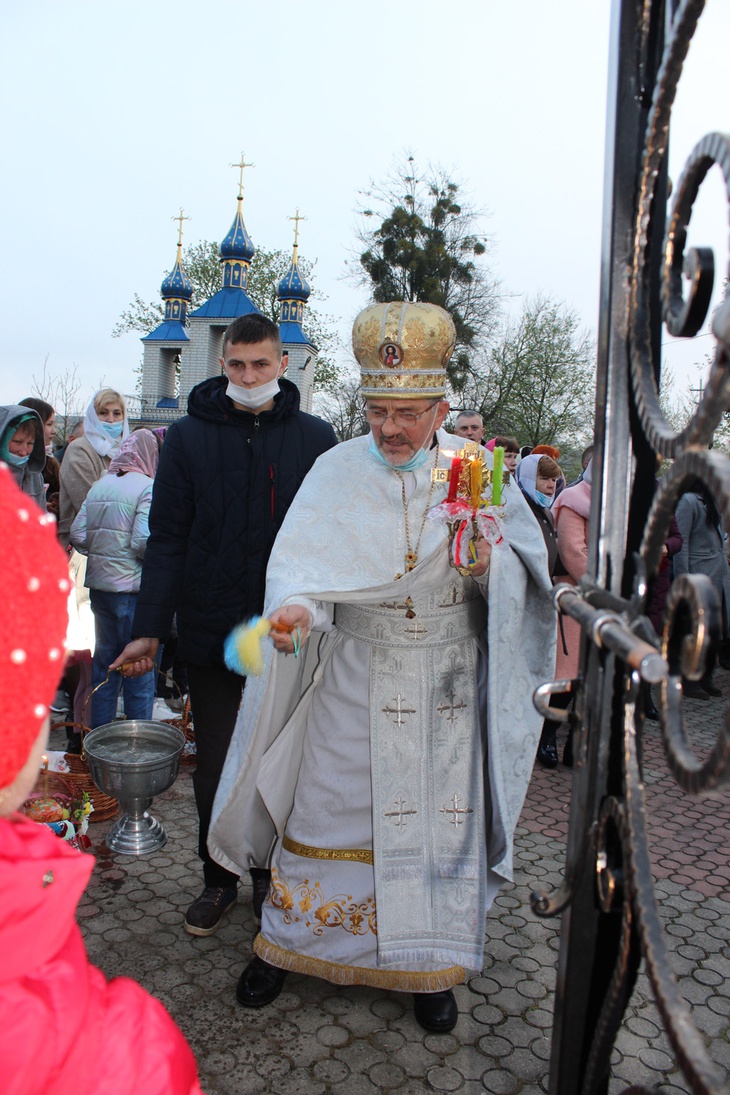 За традицією, духовенство тричі обійшло храм навкруги з молитвами та піснями. За останнім разом настоятель храму Різдва Пресвятої Богородиці ПЦУ, благочинний Рожищенської округи, протоієрей Василь Шняк, освятив кошики вірян та привітав їх з найбільшим християнським святом.
