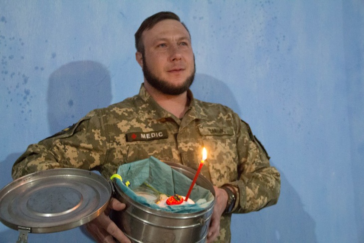 Солдат-піхотинець Василь родом з Волині. Чоловікові 54 роки. Він розповідає, що за великоднім столом за традицією першими споживають продукти, що освячені в церкві. Їх ділить старший за віком. Тож і в армійській їдальні захисники дотримуються традиційного канону — паску розділяє та роздає найстарший. А ще хлопці стукають крашанками, вітаючи один одного з Христовим Воскресінням.
