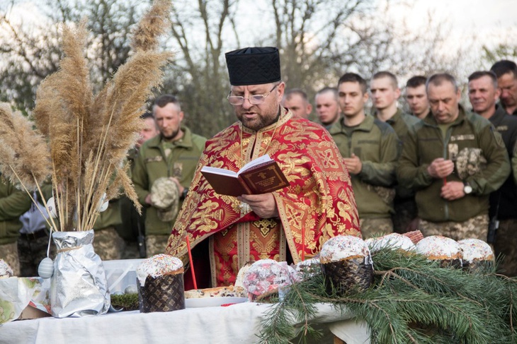 Військовий капелан, священник ПЦУ, отець Ігор займається душпастирською опікою воїнів з початку російсько-української війни. Сьогодні він проводить чин освячення великодніх страв для воїнів однієї з піхотних бригад, які входять до складу ООС.