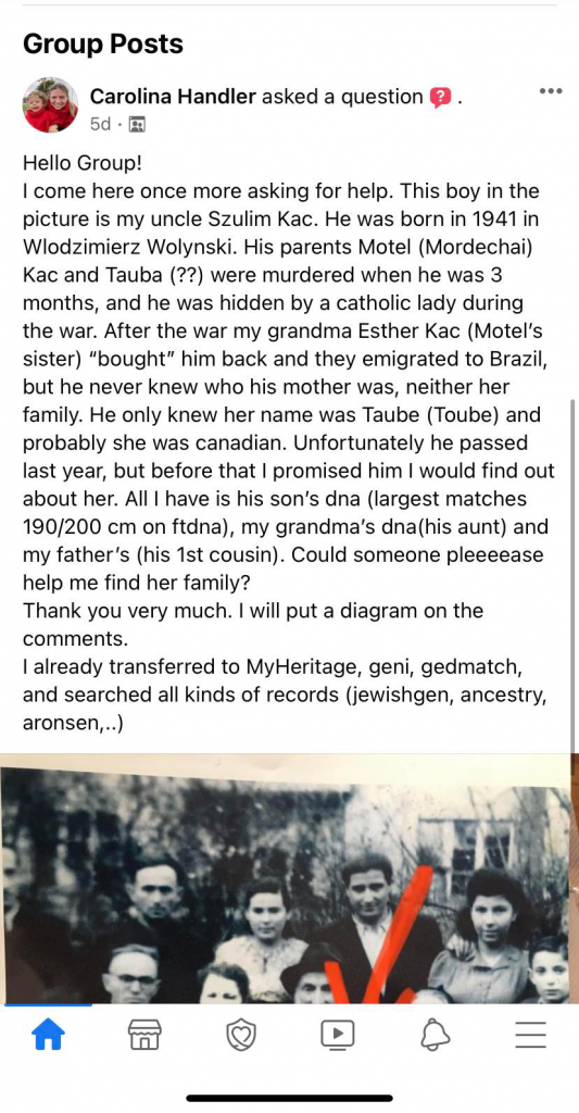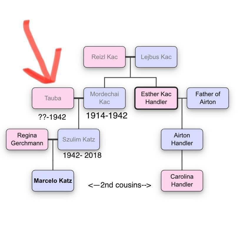 Після війни бабуся Кароліни Естер Кац (сестра Мотеля) «викупила» його, і разом вони емігрували до Бразилії, нічого ніколи так і не дізнавшись про його маму або ж її сім’ю. Вони лиш знали її ім’я – Таубе (Тоубе) і те, що вона могла емігрувати в Канаду.