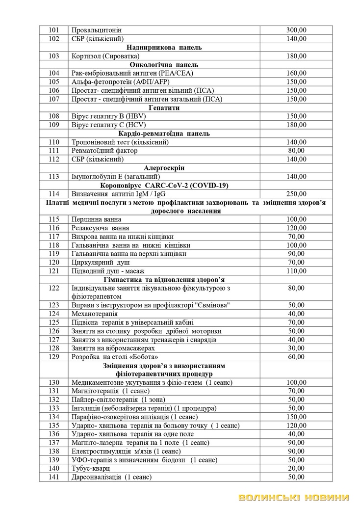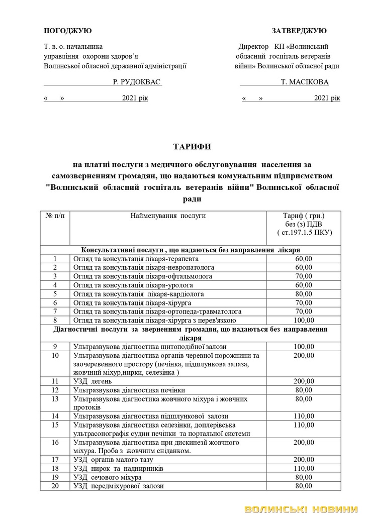 Зокрема, члени комісії погодили тарифи платних послуг, які вводяться у КП «Волинський обласний госпіталь ветеранів війни» Волинської обласної ради.
