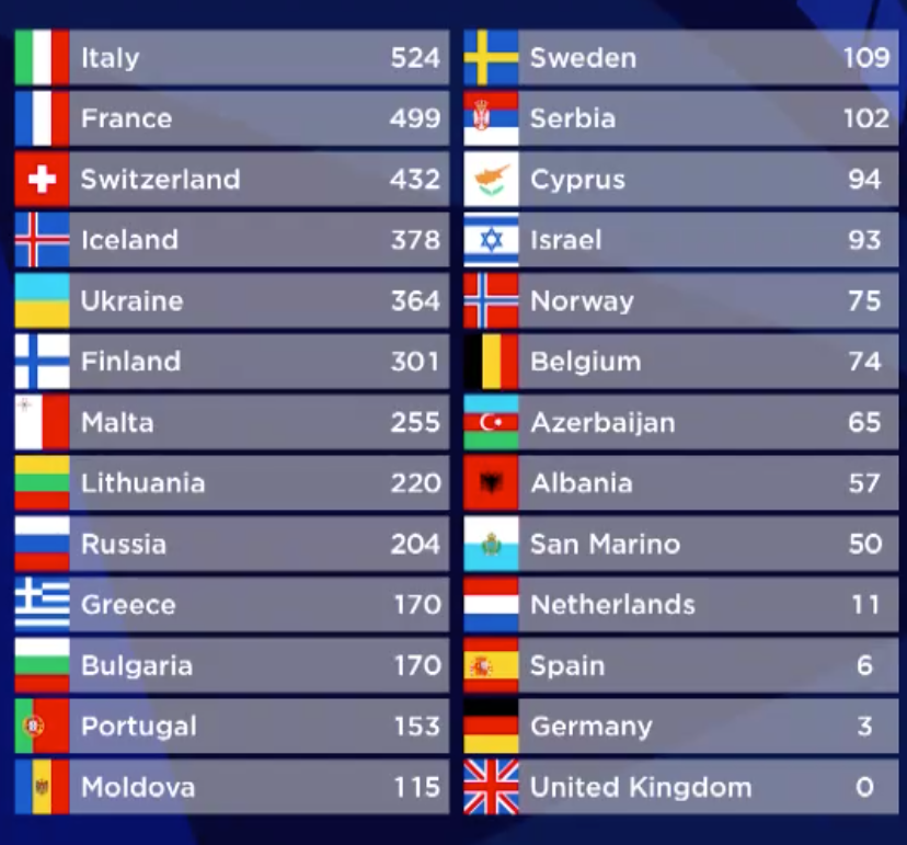Далі йдуть Франція (499 балів), Швейцарія (432) та Ісландія (378).