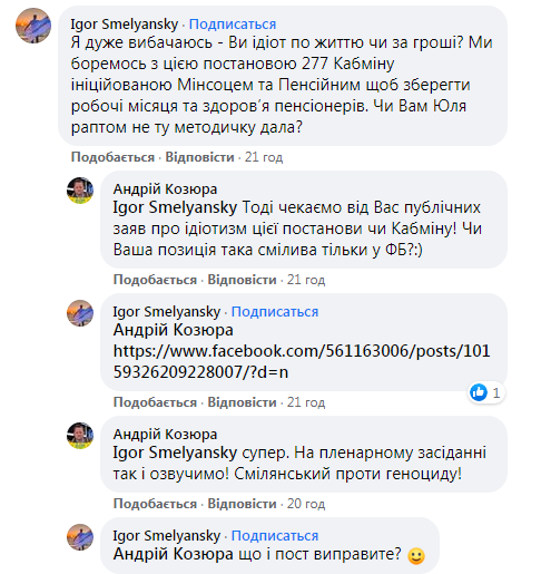 «Я дуже вибачаюсь – Ви ідіот по життю чи за гроші? Ми боремось з цією постановою 277 Кабміну, ініційованою Мінсоцем та Пенсійним, щоб зберегти робочі місяця та здоров’я пенсіонерів. Чи Вам Юля раптом не ту методичку дала?» – емоційно написав Смілянський.