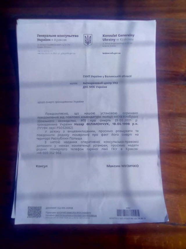 До ГУНП у Волинській області надійшов лист від польських колег про те, що у Польщі 23 травня помер Назар Філімончук, 18 травня 1998 року народження.
