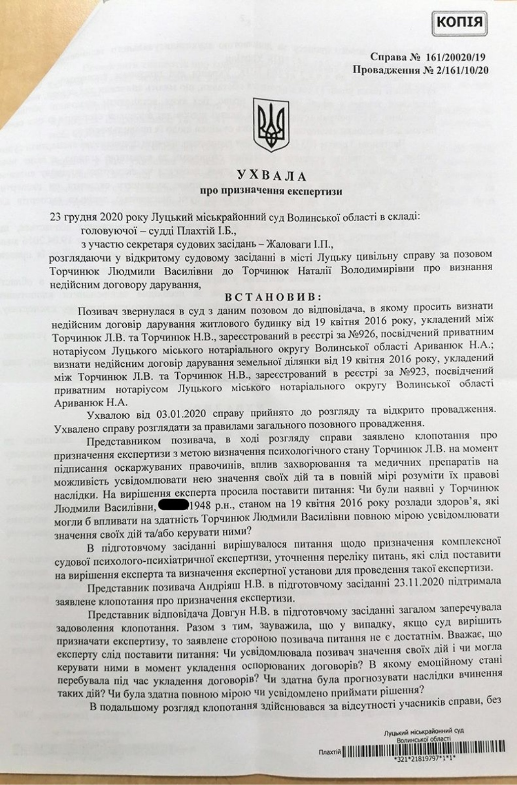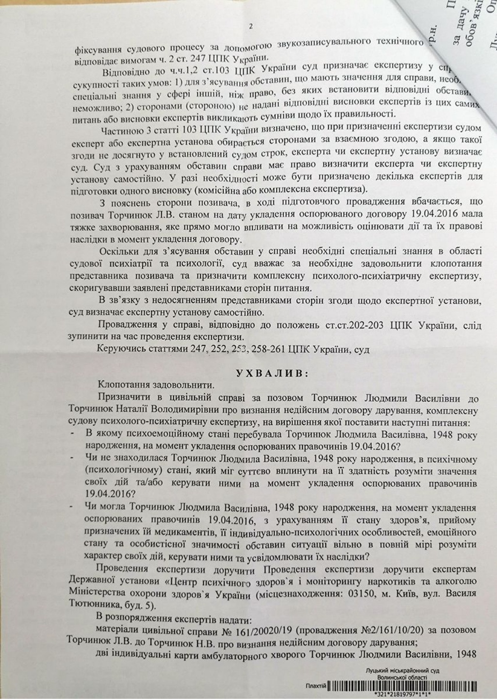 – Призначена судово-психіатрична експертиза по позивачці стосовно того, чи могла вона усвідомлювати свої дії і керувати ними в момент укладення договору дарування в нотаріальному порядку. Тобто на якийсь проміжок часу позивачці намагаються надати статусу особи, яка не розуміла, що вона віддаровує будинок своїй невістці. Саме в той період часу, – розповідає адвокат Сергій Книш. – Пройшов тривалий період часу – майже чотири роки. Всі строки позовної давності вийшли, але це не перешкодило ініціатору цих справ, так його назвемо, породжувати таку штучну справу. Більше того, в ході цієї справи також була подана заява з протилежної сторони від опонентів про забезпечення позову, наслідком чого стали ухвали про накладення арешту. Без жодного доказу, безпідставні. Накладений арешт до вирішення справи по суті.