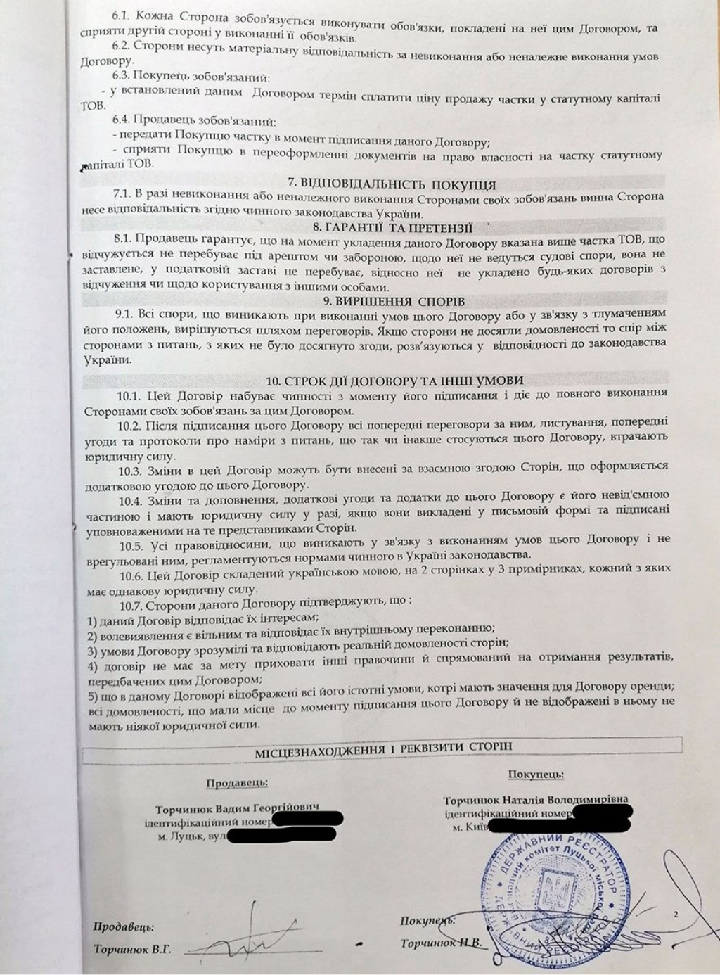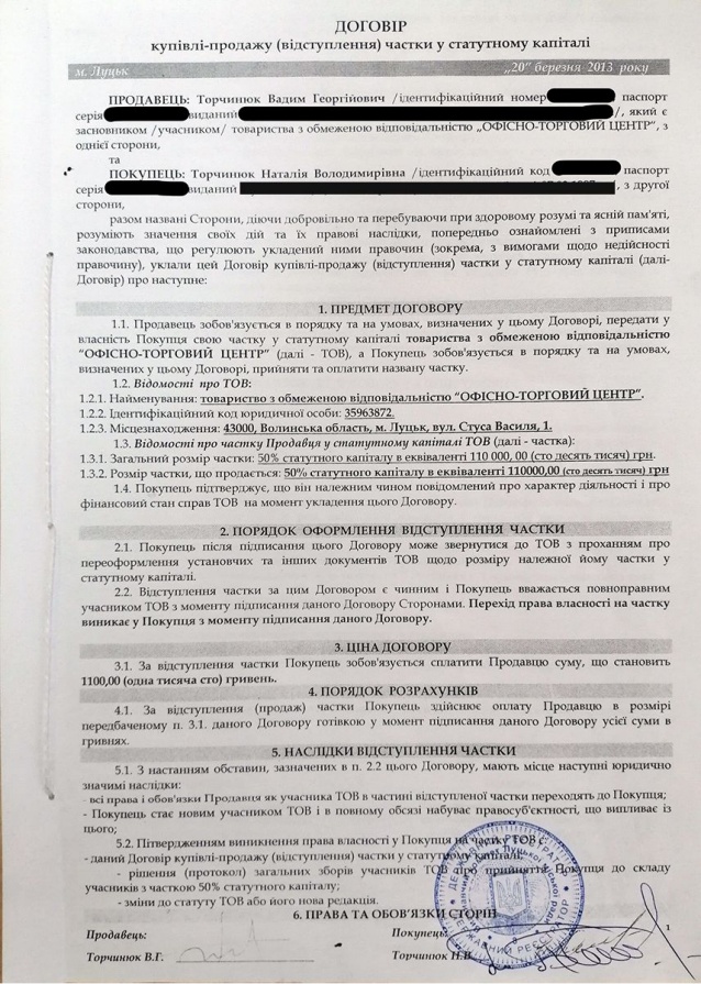 Схожа історія і навколо «Офісно-торгового центру». Вадим Торчинюк звернувся до суду аби добитися скасування і визнання недійсним договору купівлі-продажу частки у фірмі, який вісім років тому, у березні 2013 року, уклав із своєю дружиною. У суді служитель Феміди стверджує, що не підписував цей договір і натякає, що це – підробка.