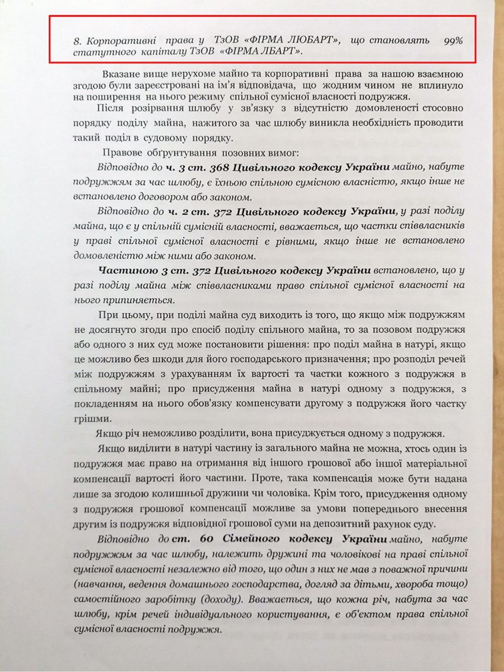 Судячи з оспорюваного в суді договору, свою частку в «Офісно-торговому центрі» розміром у 110 000 гривень він продав дружині за 1100 гривень.