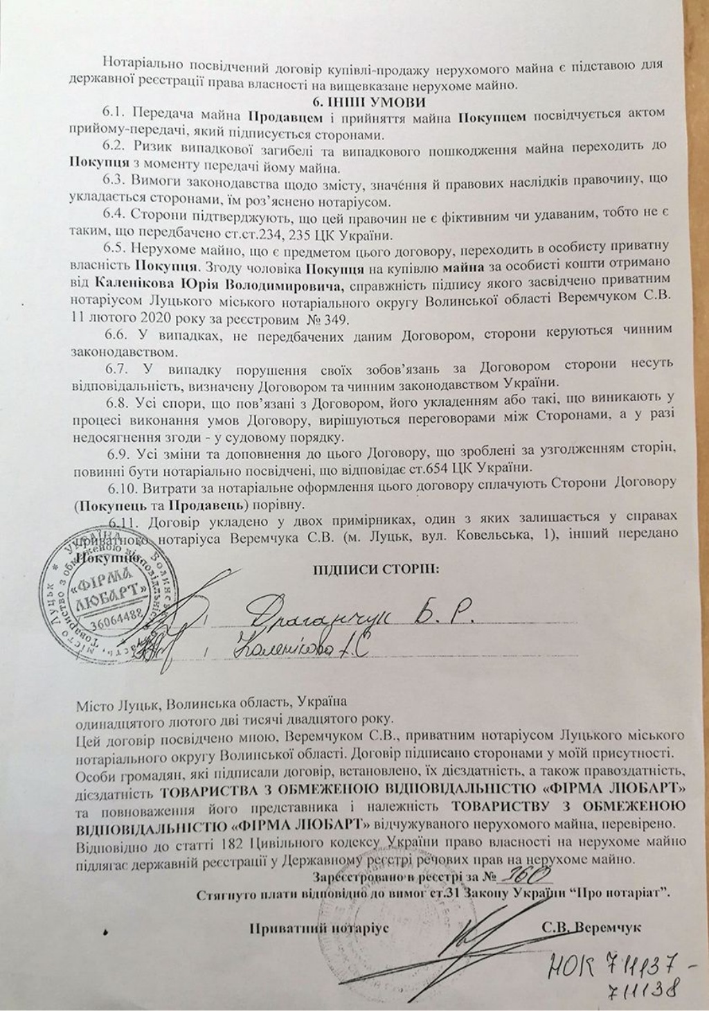 Зараз вже за нашою ініціативою в Луцькому міськрайонному суді є справа, предмет якої – визнання недійсним цього договору купівлі-продажу невідомій особі Каленіковій, якої ніде немає. Яку і суд чомусь відмовився викликати, аби послухати, чи відповідає дійсності договір купівлі-продажу і ті пункти, в яких зазначено, що вона оглянула те приміщення. Заяв стосовно недоліків, перешкод для цього договору вона не вбачала і свідомо на основі власного волевиявлення підписала ці документи. Суд згодився викликати безпосередньо Драганчука, щоб його допитати.