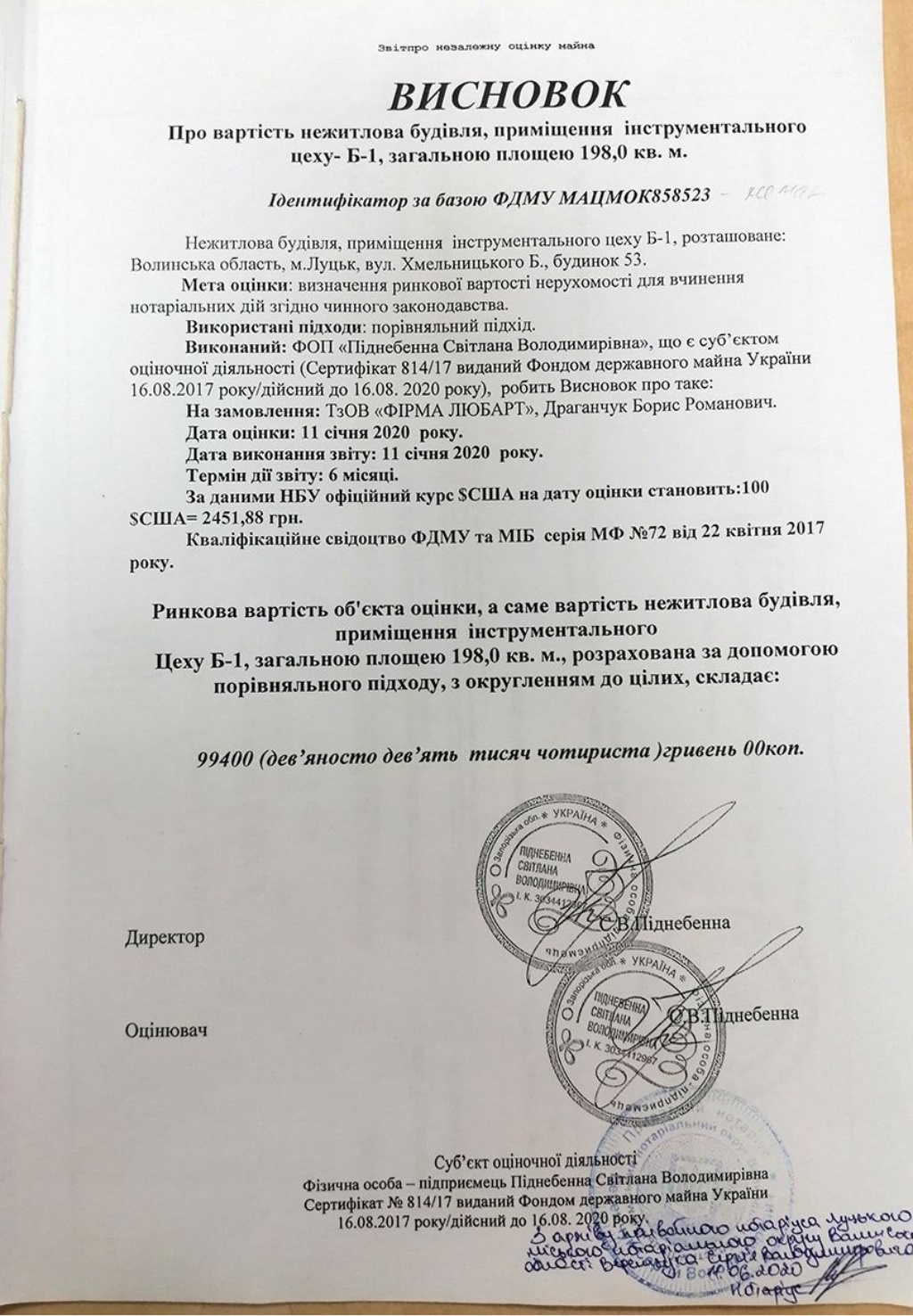 Тим не менше, взимку 2020 року це не завадило директору компанії Борису Драганчуку продати приміщення інструментального цеху площею 198 кв. м. на цій ділянці лучанці Анастасії Каленіковій. Перед продажем оцінщиця із Запорізької області Світлана Піднебенна зуміла оцінити майно у 99 400 гривень!
