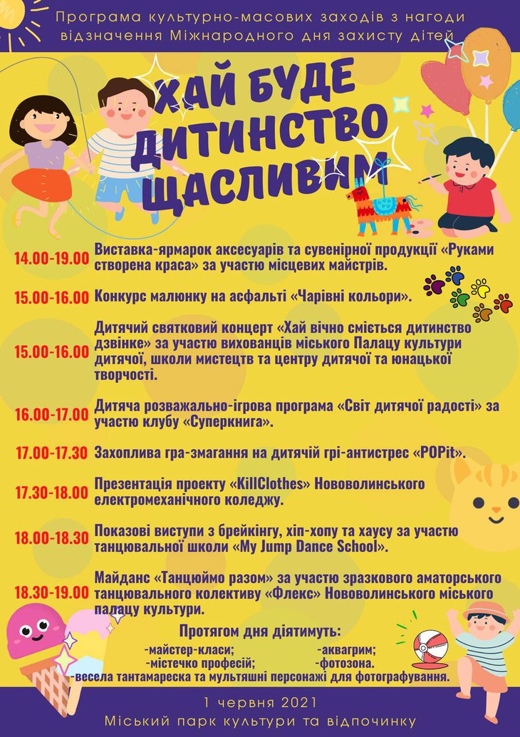У вівторок, 1 червня, у Нововолинському міському парку культури та відпочинку відбудуться заходи присвячені Міжнародному дню захисту дітей.