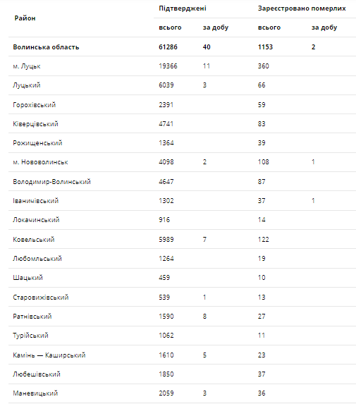 За останню добу на Волині зареєстровано 40 нових підтверджених випадків коронавірусної хвороби COVID-19 (з них дітей – 1, медпрацівників – 1). Одужало за добу – 121 особа, летальних випадків – 2.
