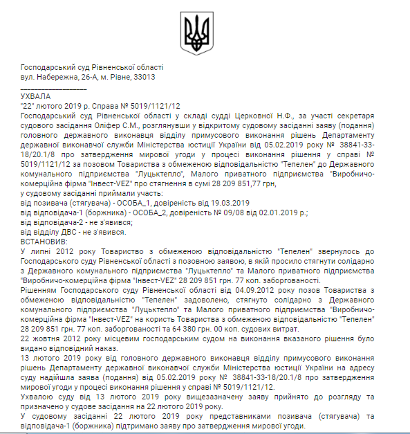 28 лютого 2019 року мирову угоду затвердив Господарський суд Рівненської області.