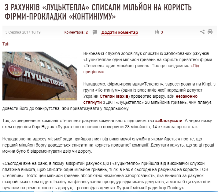 «Фірма-прокладка «Тепелен», зареєстрована на Кіпрі, з групи «Континіум» (один із власників якої народний депутат України Степан Івахів) провертає аферу, аби незаконно стягнути з ДКП «Луцьктепло» 28 мільйонів гривень, чим планує довести його до банкрутства, аби приватизувати у подальшому. Так, за зверненням компанії «Тепелен» рахунки комунального підприємства заблокували. А через низку схем подвоїли борг. Відтак «Луцьктепло » повинно повернути 28 мільйонів, 14 з яких за просто так».