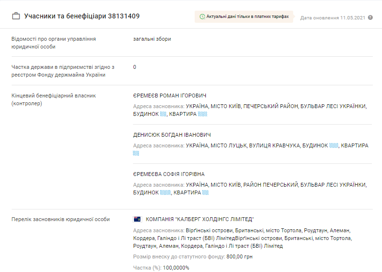 Засновник цієї фірми – кіпрський офшор, а кінцеві бенефіціарні власники – діти покійного співвласника «Континіуму», нардепа Ігоря Єремеєва – Роман Єремеєв і Софія Єремеєва.