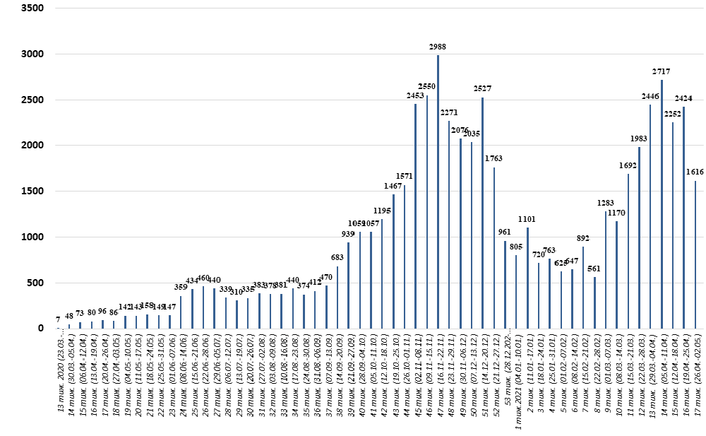 Щотижнева динаміка захворюваності на COVID-19 у Волинській області у 2020 – 2021 роках (станом на 02.05.2021)