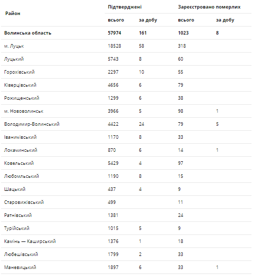 За останню добу на Волині зареєстровано 161 новий підтверджений випадок коронавірусної хвороби COVID-19 (з них дітей – 9, медпрацівників – 6). Одужало за добу – 685 осіб, летальних випадків – 8.