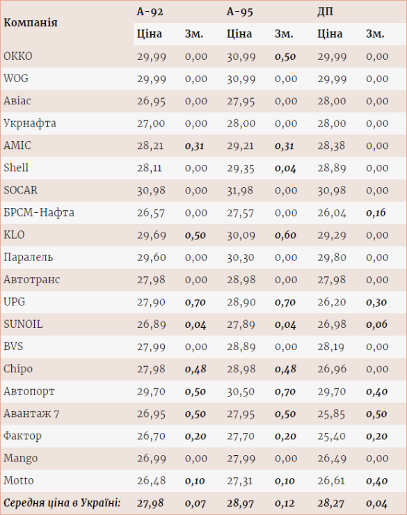 На «Авантаж 7» усе пальне здорожчало на 50 коп./л: бензин А-92 – до 26,95 грн/л, А-95 – до 27,95 грн/л, ДП – до 25,85 грн/л. На заправках Chipo, Shell, AMIC, «Автопорт» і «Фактор» ціни на пальне зросли на 10-70 коп./л.