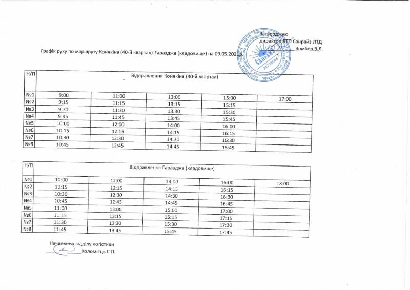 Управління транспорту та зв'язку міської ради інформує про графік руху автобусів, що будуть здійснювати перевезення пасажирів у Провідну неділю (09.05.2021) до кладовища у с.Гаразджа, за маршрутом «Конякіна (40-й квартал) – Гаразджа» (Конякіна, Гордіюк, Соборності, Молоді, Відродження, Рівненська, с.Гаразджа).