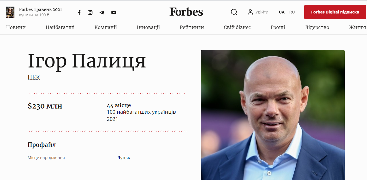 У рейтингу Forbes Ігор Палиця посідає із 230 мільйонами доларів 44 місце.