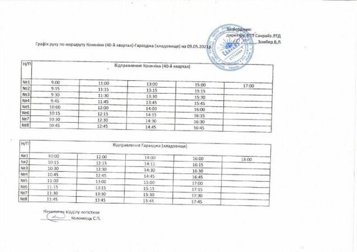Також на сайті міськради оприлюднили графік руху автобусів, що будуть здійснювати перевезення пасажирів у Провідну неділю (09.05.2021) до кладовища у Гаразджі за маршрутом «Конякіна (40-й квартал) – Гаразджа» (Конякіна, Гордіюк, Соборності, Молоді, Відродження, Рівненська, с.Гаразджа).