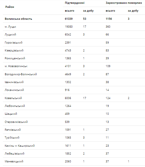 За останню добу на Волині зареєстровано 53 нових підтверджених випадки коронавірусної хвороби COVID-19 (з них дітей – 3, медпрацівників – 3). Одужало за добу – 497 осіб, летальних випадків – 3.