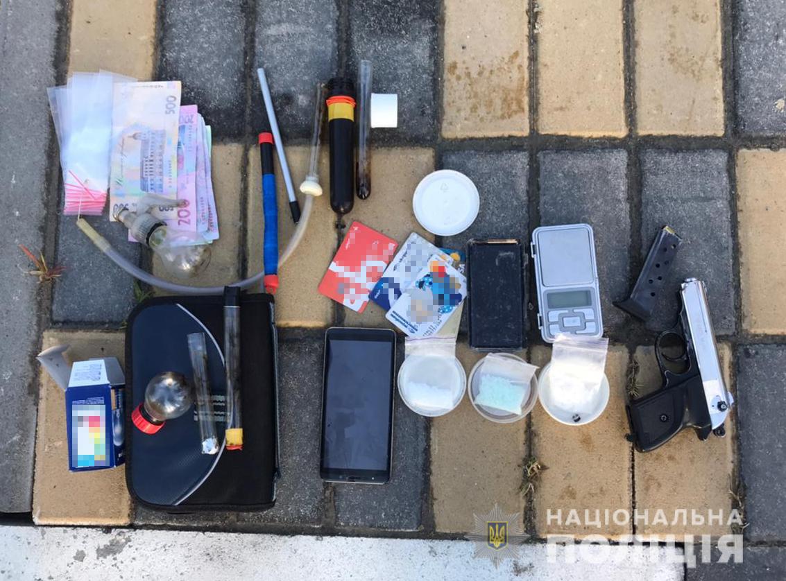 У зловмисника вилучили 30 г. психотропної речовини Альфа PVP та мобільний телефон. Під час проведення невідкладного обшуку в автомобілі Volkswagen Transporter, на якому пересувався правопорушник, поліцейські вилучили ще 20 г психотропної речовини Альфа PVP, 10 амфетаміну, пістолет, 2 набої, калібру 9 мм, електронні ваги, банківські картки, зіп-пакети та гроші.