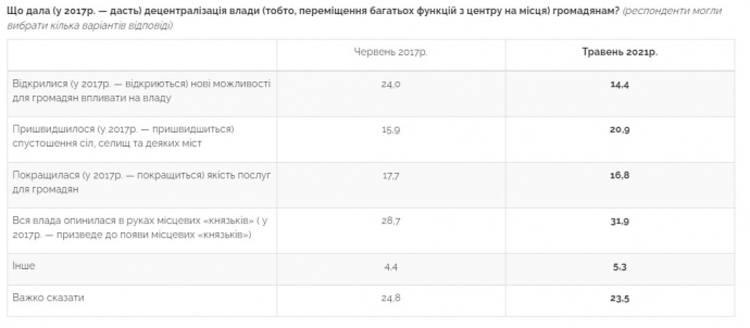 Відповідаючи на запитання, що дала децентралізація влади (тобто, переміщення багатьох функцій з центру на місця) громадянам, 32% опитаних зазначили, що вся влада опинилася в руках місцевих «князьків», 21% – що пришвидшилося спустошення сіл, селищ та деяких міст, 17% – що поліпшилася якість послуг для громадян, 14% – що відкрилися нові можливості для громадян впливати на владу.