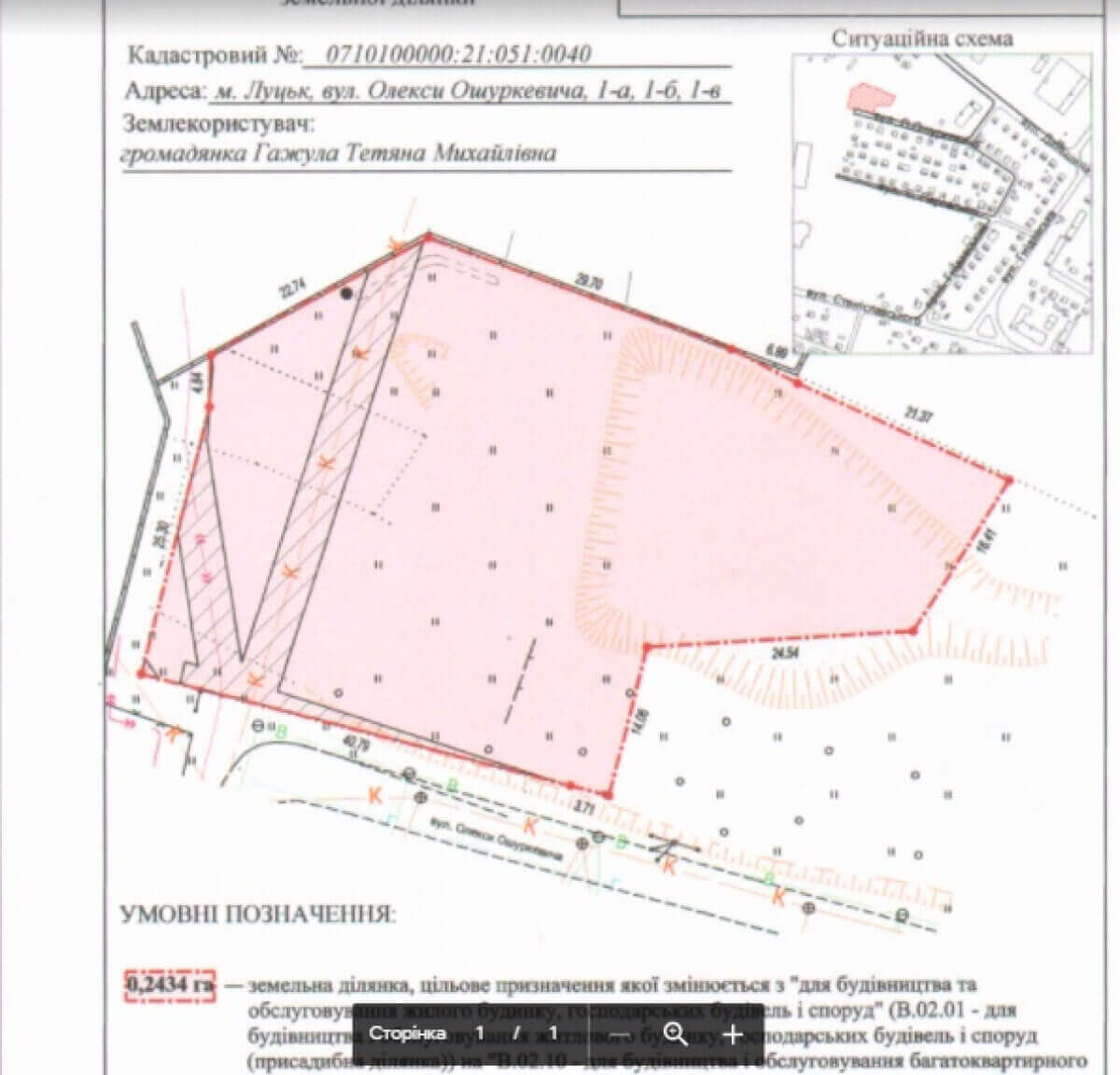 Земельна ділянка прощею 24 сотих свого часу придбала Гажула Тетяна Михайлівна, яка нині просить змінити цільове призначення землі всупереч генплану міста Луцька. Така хаотична забудова навантажує вуличну та інженерну мережу міста.
