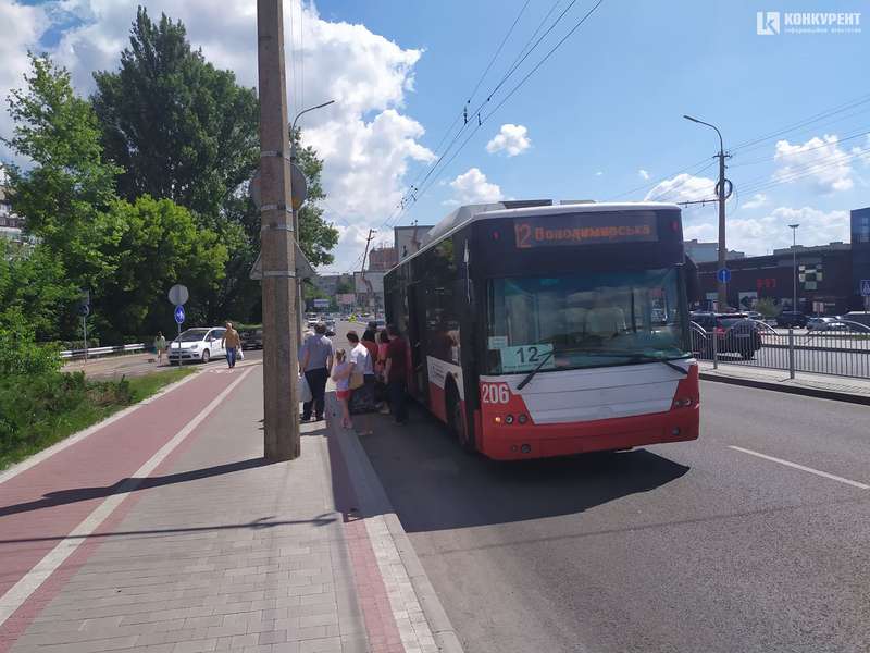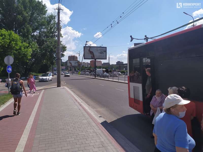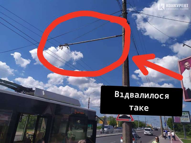 Відірвана частина опори висить у повітрі і створює серйозні незручності для водіїв. Тролейбуси її ледь оминають.