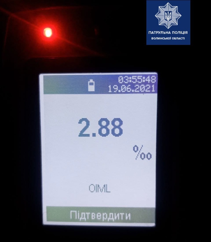 Під час спілкування з водієм, останній не пред'явив посвідчення водія та мав ознаки алкогольного сп’яніння. Водій пройшов огляд на визначення стану сп’яніння на місці зупинки. Результат позитивний – 2,88 проміле, що в 14 разів перевищує допустиму норму.