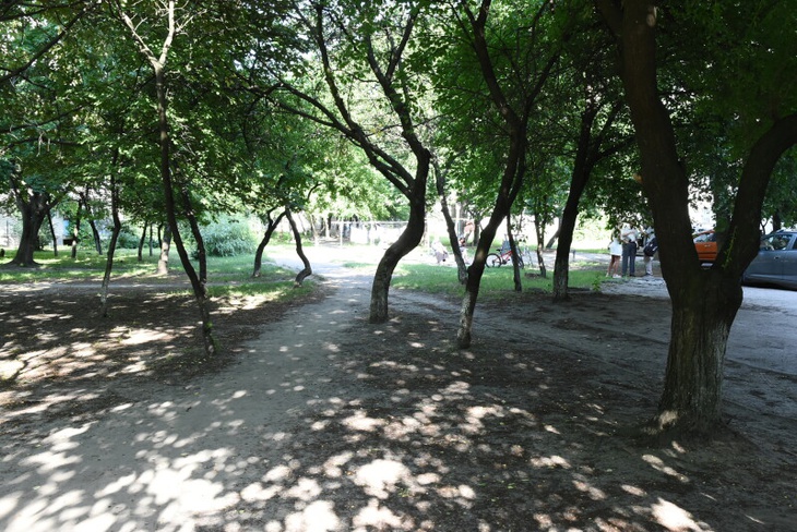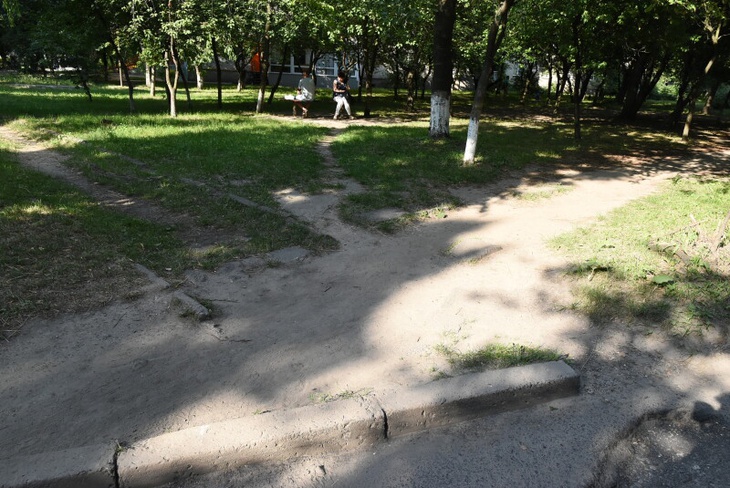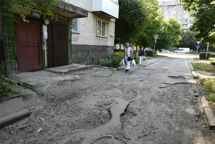 Двір потребує серйозного ремонту: дорожнє полотно та пішохідна зона розбиті, об’єкти благоустрою відсутні.